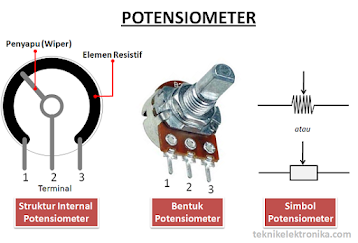 Potensiometer (POT) adalah salah satu jenis Resistor yang Nilai Resistansinya dapat diatur sesuai dengan kebutuhan Rangkaian Elektronika ataupun kebutuhan pemakainya. Potensiometer merupakan Keluarga Resistor yang tergolong dalam Kategori Variable Resistor. Secara struktur, Potensiometer terdiri dari 3 kaki Terminal dengan sebuah shaft atau tuas yang berfungsi sebagai pengaturnya. Gambar dibawah ini menunjukan Struktur Internal Potensiometer beserta bentuk dan Simbolnya.
